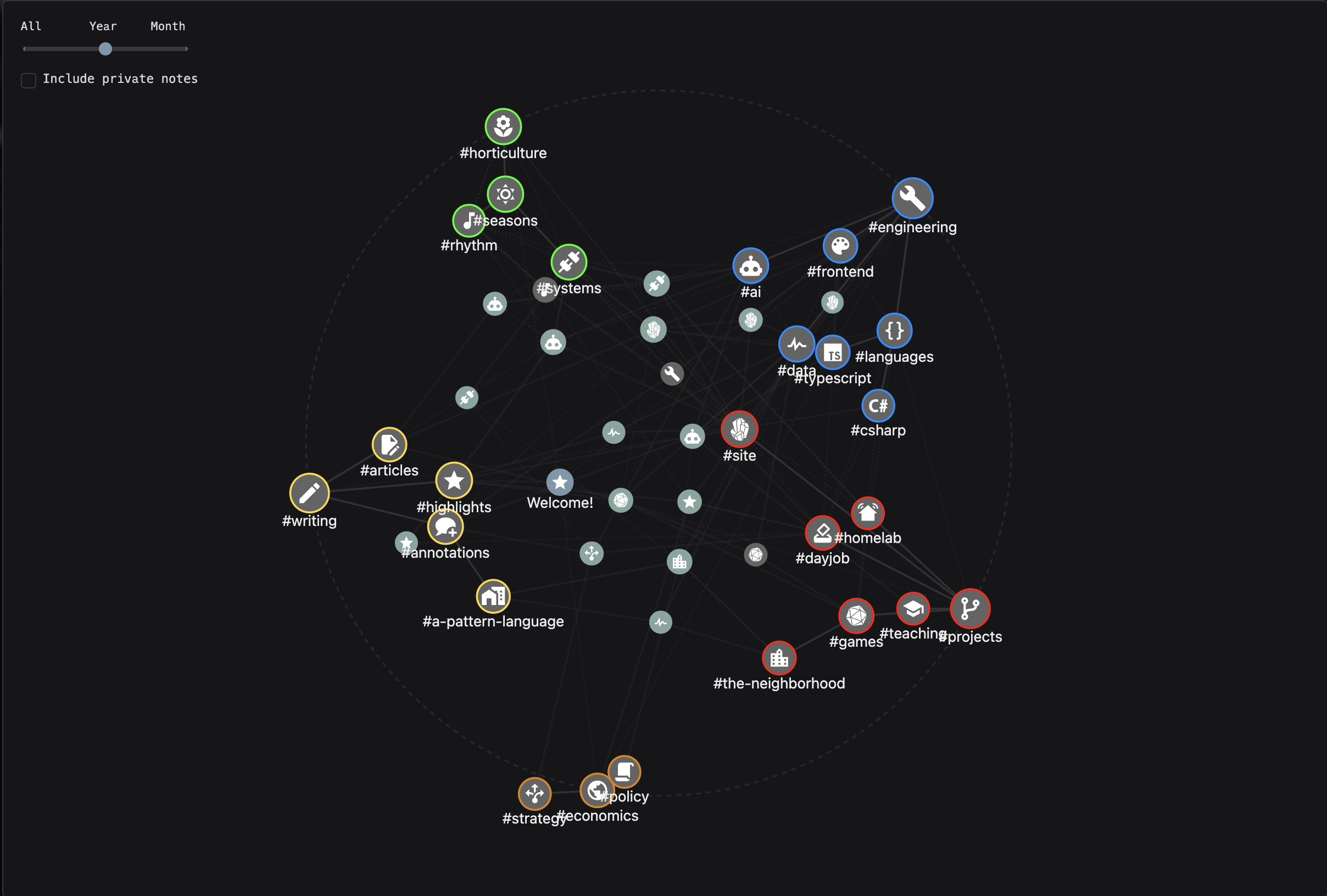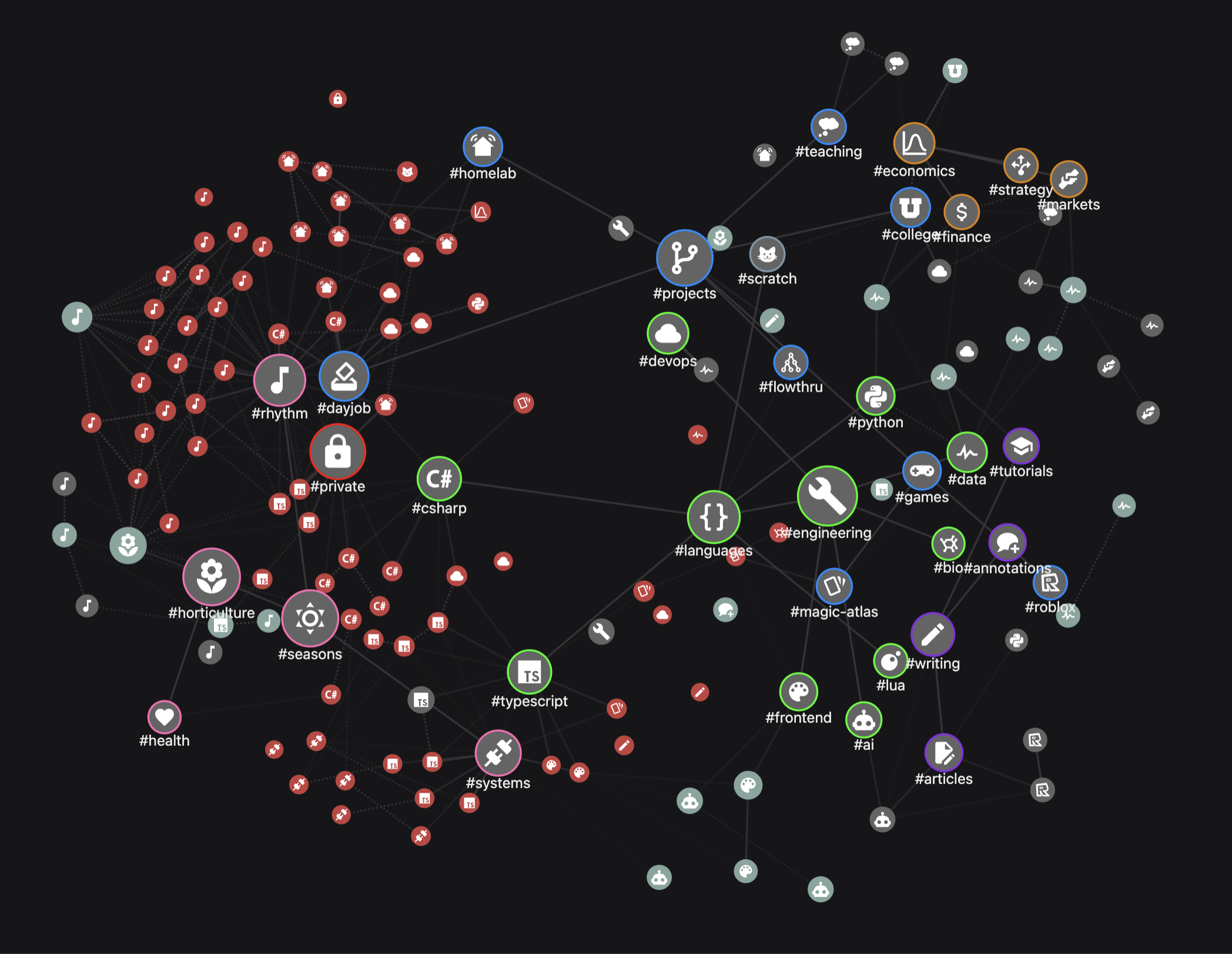 An example of this: initially, when I was using (largely) the graph rendering logic of the vanilla Quartz site, my graph was far more… blobby. Any global organization was very much an afterthought. I was primarily concerned with simply churning out posts and hyperlinking where appropriate, and wasn’t nearly as concerned with how the global graph looked. I’d call this a libertarian, node-first approach:
